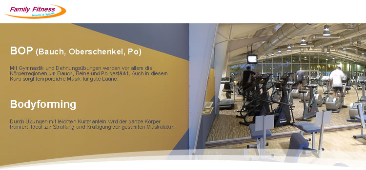 Mit insgesamt über 5000m² Trainingsfläche, über 400 Kursaktivitäten im Monat sowie einem erstklassigen Service wird Ihr Aufenthalt in allen Family Fitness Clubs garantiert zum Erlebnis.