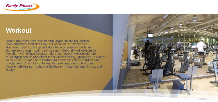 Das Expertenteam von Family Fitness besteht aus Physio-/Fitnesstherapeuten sowie Diplom-Sportlehrern und unterstützt unsere Kunden fachkompetent in der Verwirklichung persön- licher Ziele. Lassen Sie sich von den Family Fitness-Leistungen überzeugen und nehmen Sie das Angebot eines kostenfreien Beratungs- gesprächs und Probetrainings in Anspruch. Selbstverständlich können Sie in allen vier Family Fitness Clubs jedwede Aktivität vor- nehmen, wenn es um Wellness, Training oder Kurse geht. Allerdings hat jeder Club einen eigenen Schwerpunkt und verschiedene Ansätze für die Gesundheit.